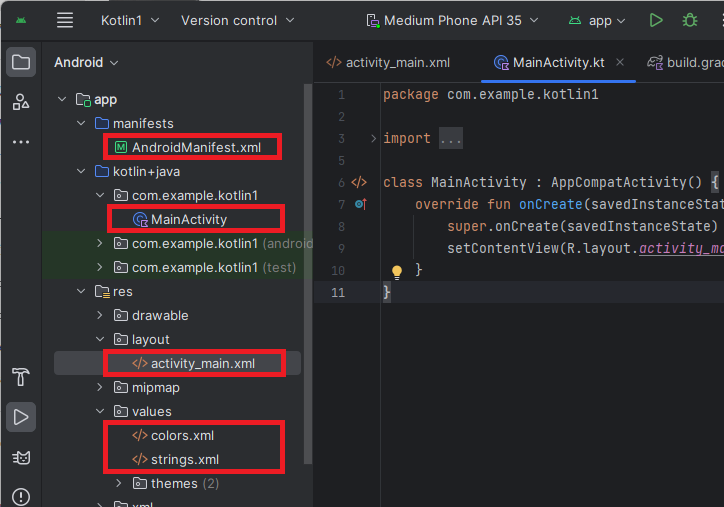 プロジェクト作成直後の初期状態ではactivity_main.xmlを起動するようになっています。